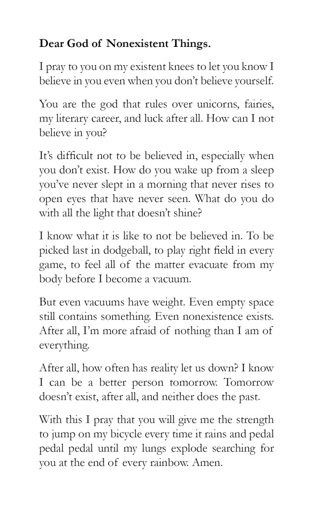 Uncategorized Dear God of Nonexistent Things Posted by Gray on August 12, 2020 Share this: Click to share on X (Opens in new window) X Click to share on Facebook (Opens in new window) Facebook Like Loading...